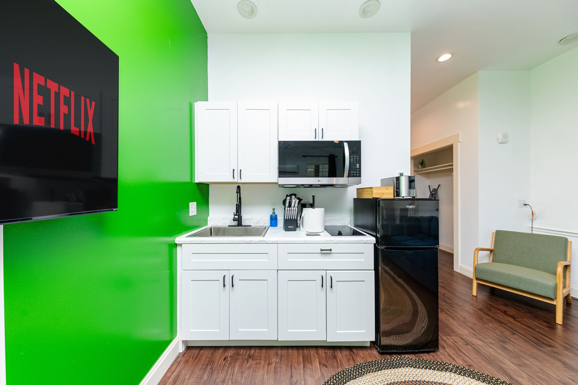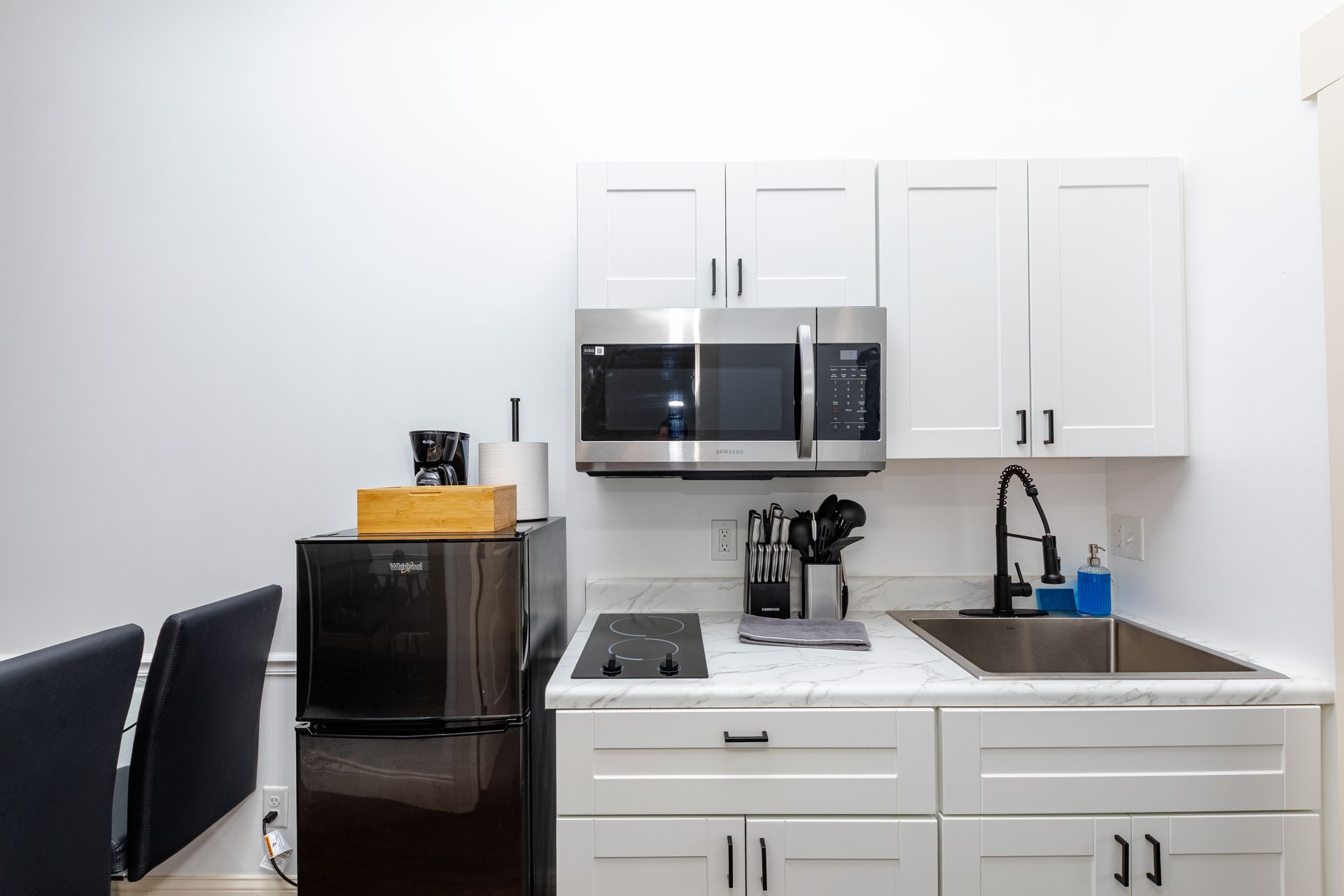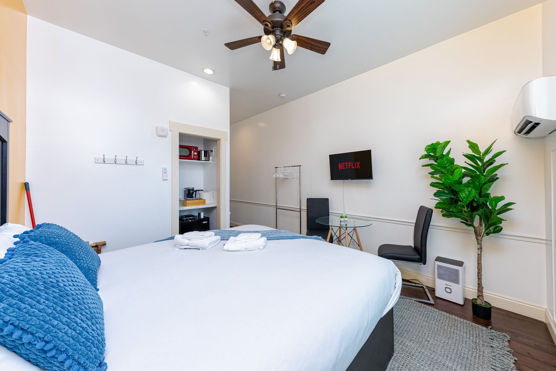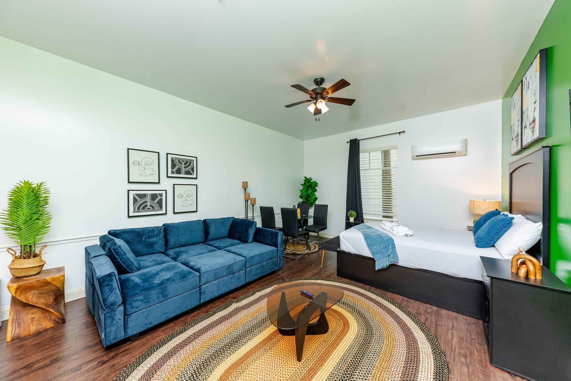 This studio-style unit includes a queen bed, a queen sofa bed, a kitchen - all within the same open living space. Plus one bathroom.