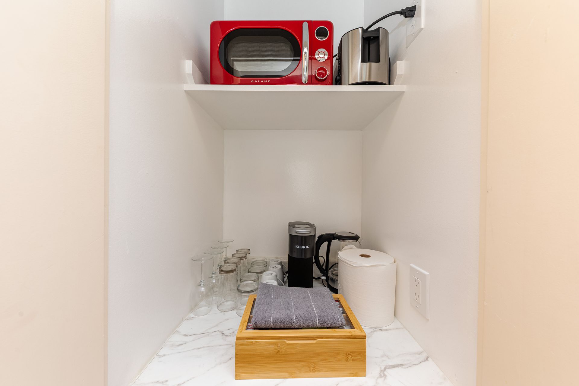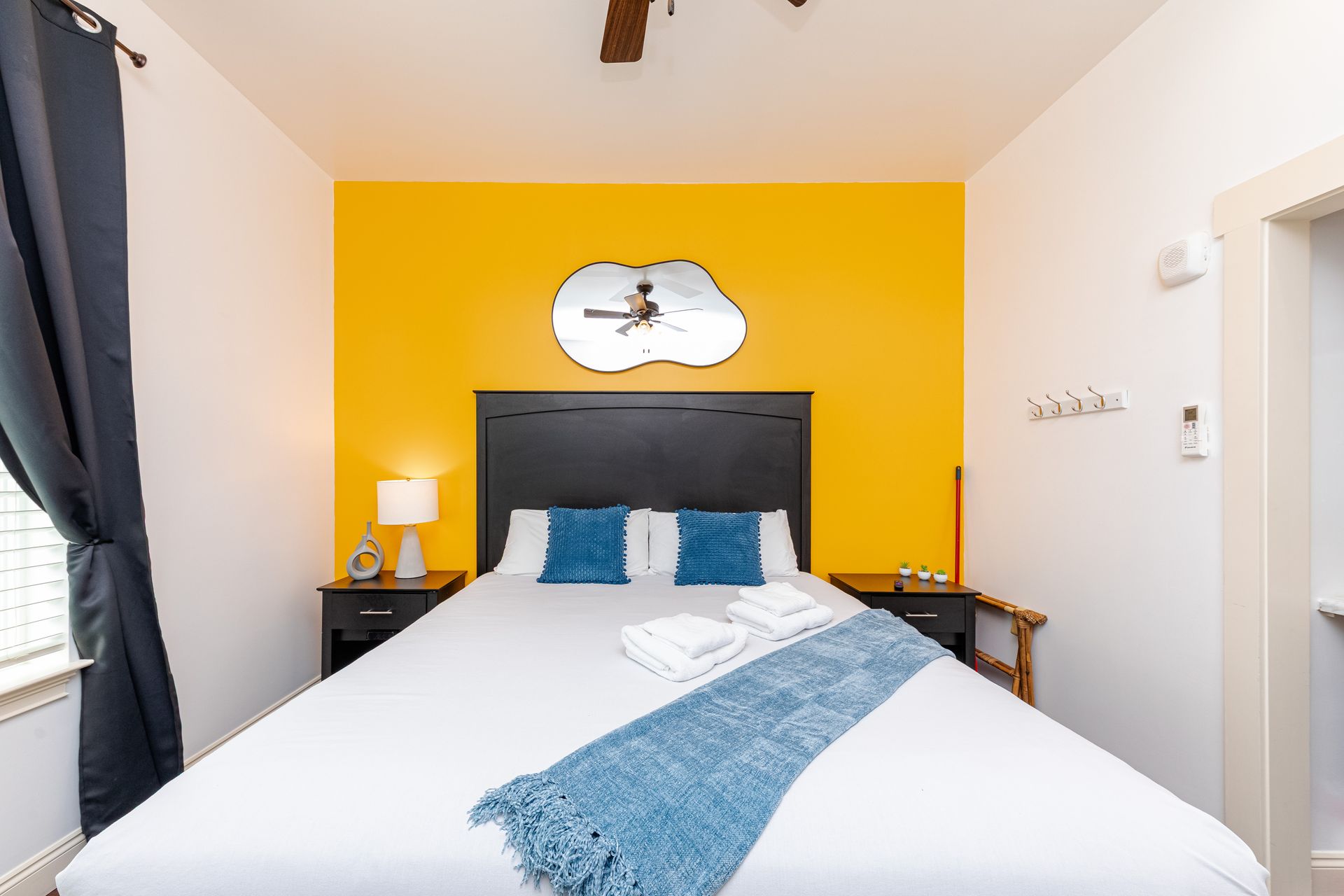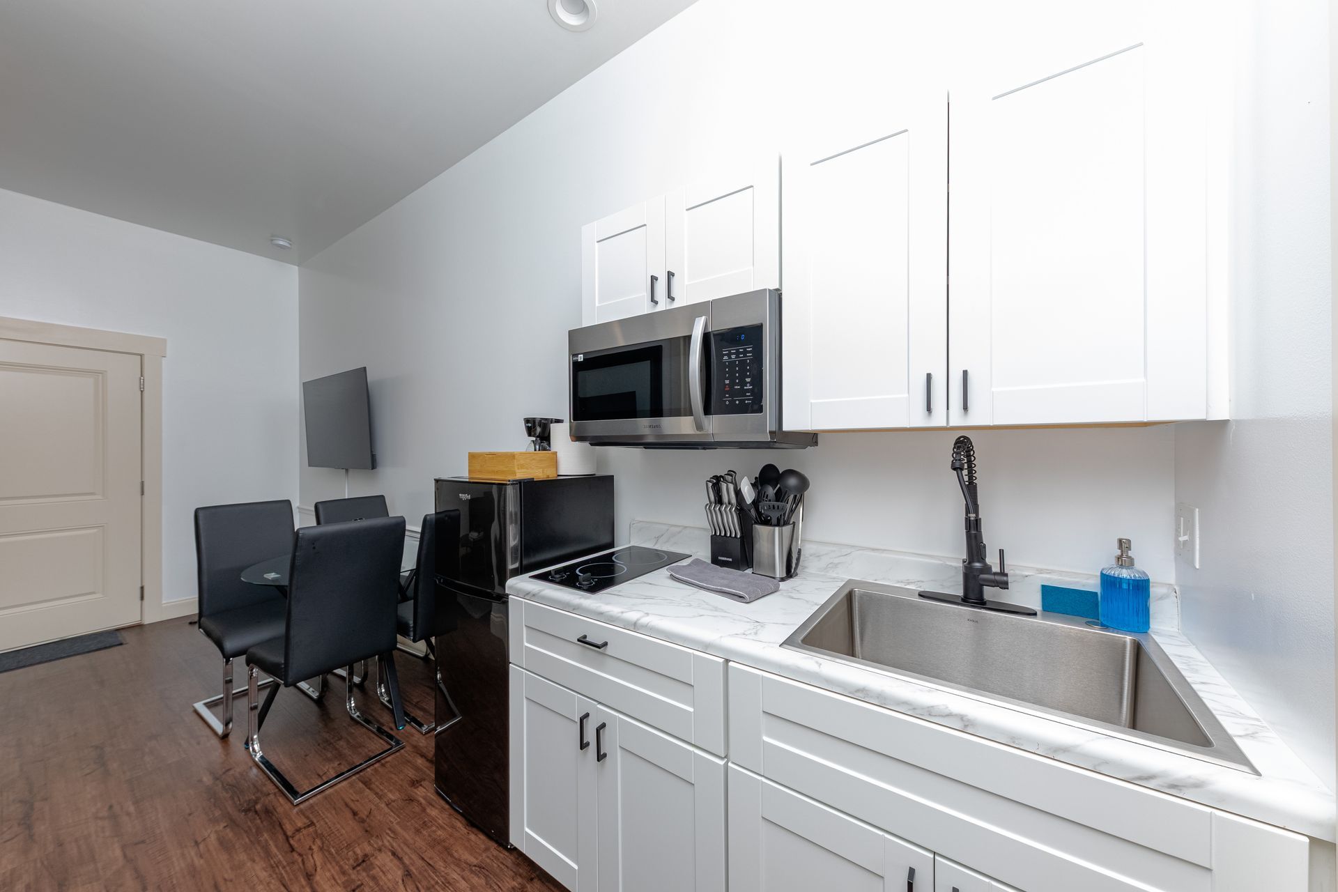 This studio-style unit includes a queen bed, a queen sofa bed, a kitchen - all within the same open living space. Plus one bathroom.