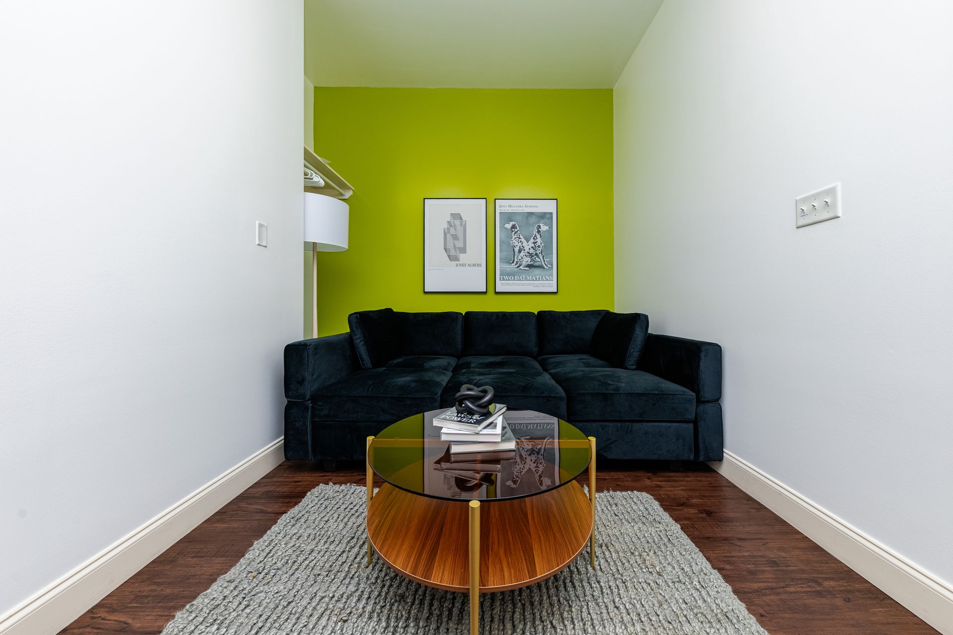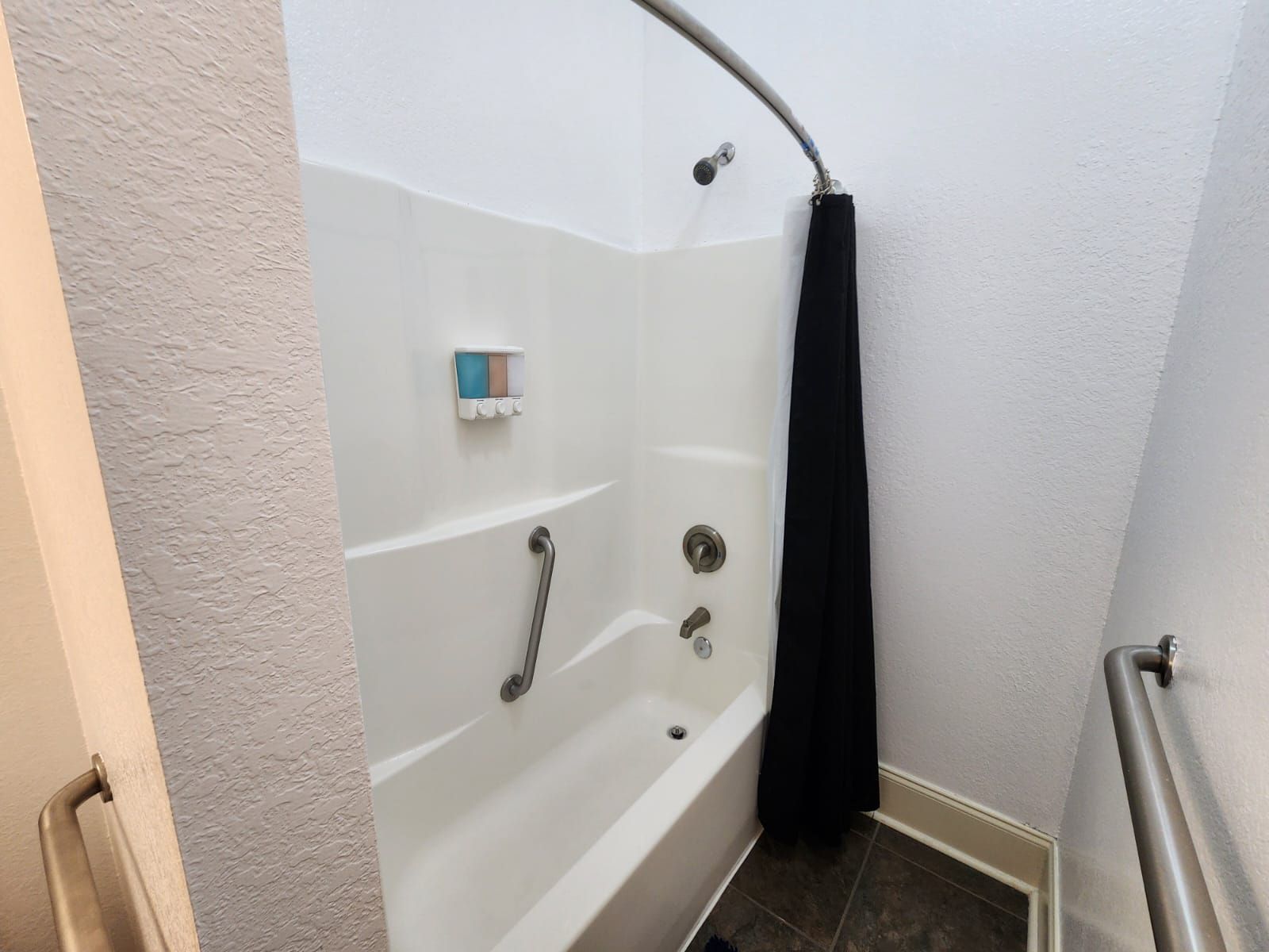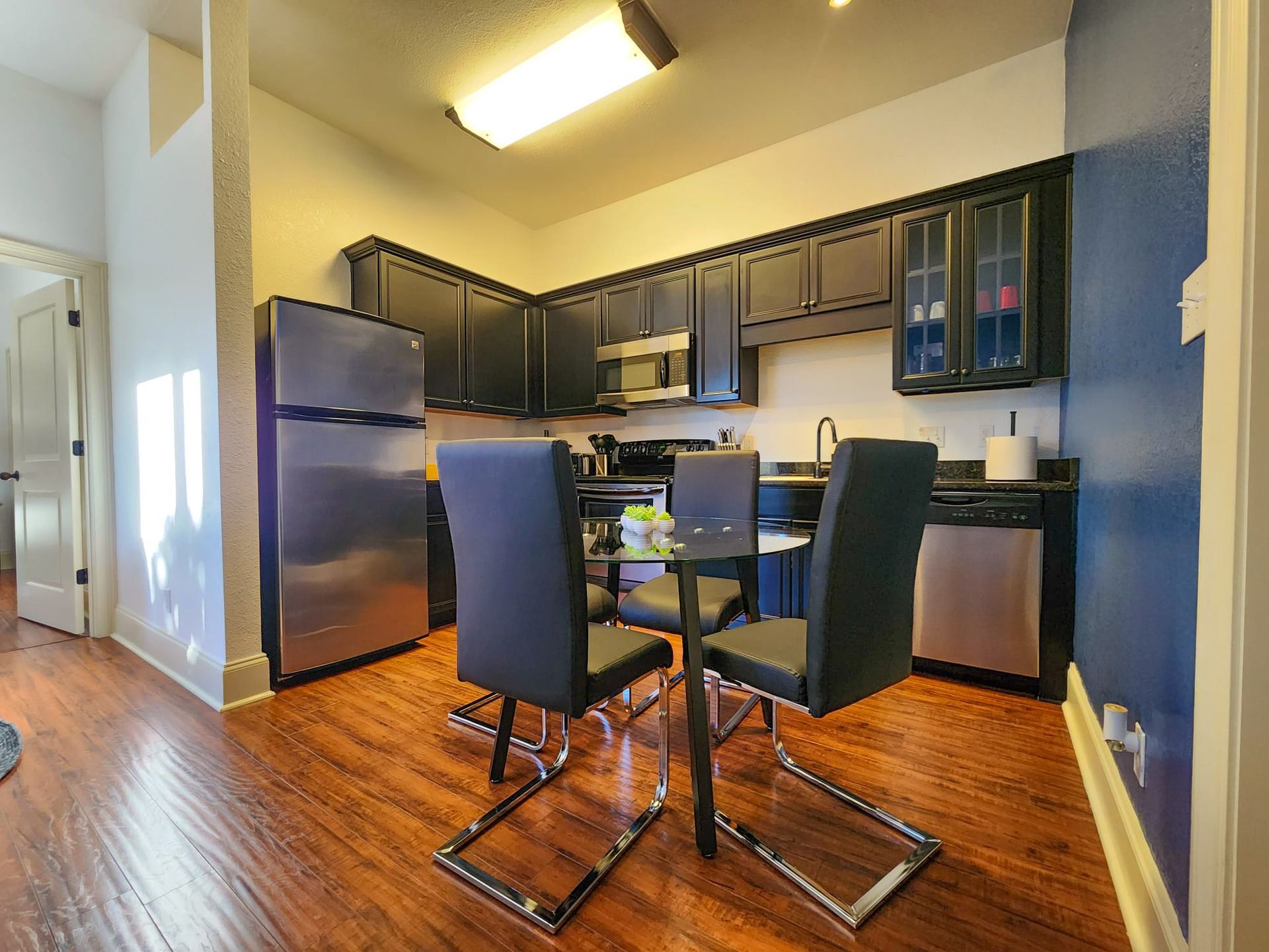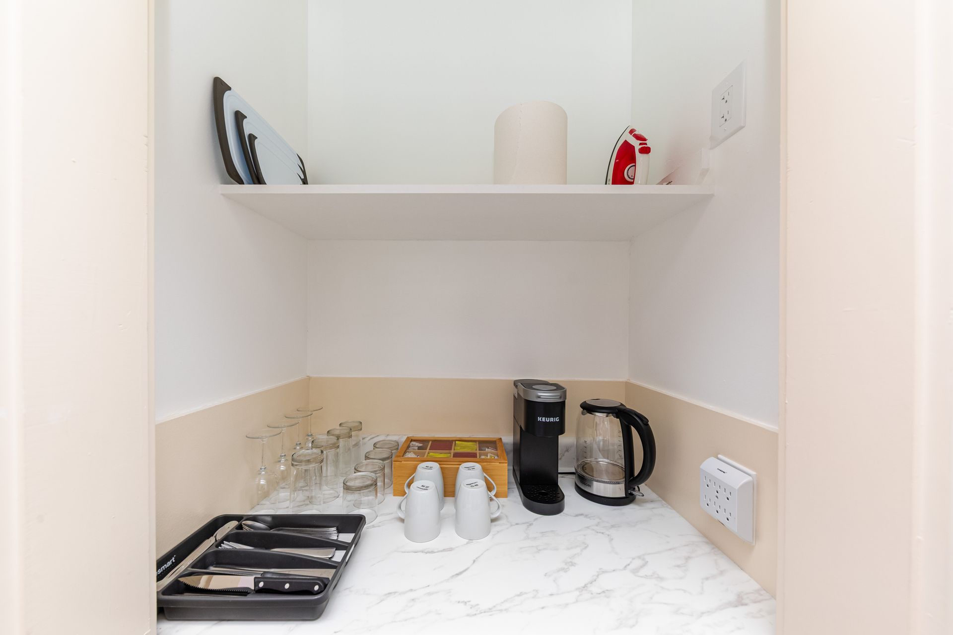 This studio-style unit includes a queen bed, a queen sofa bed, a kitchen - all within the same open living space. Plus one bathroom.